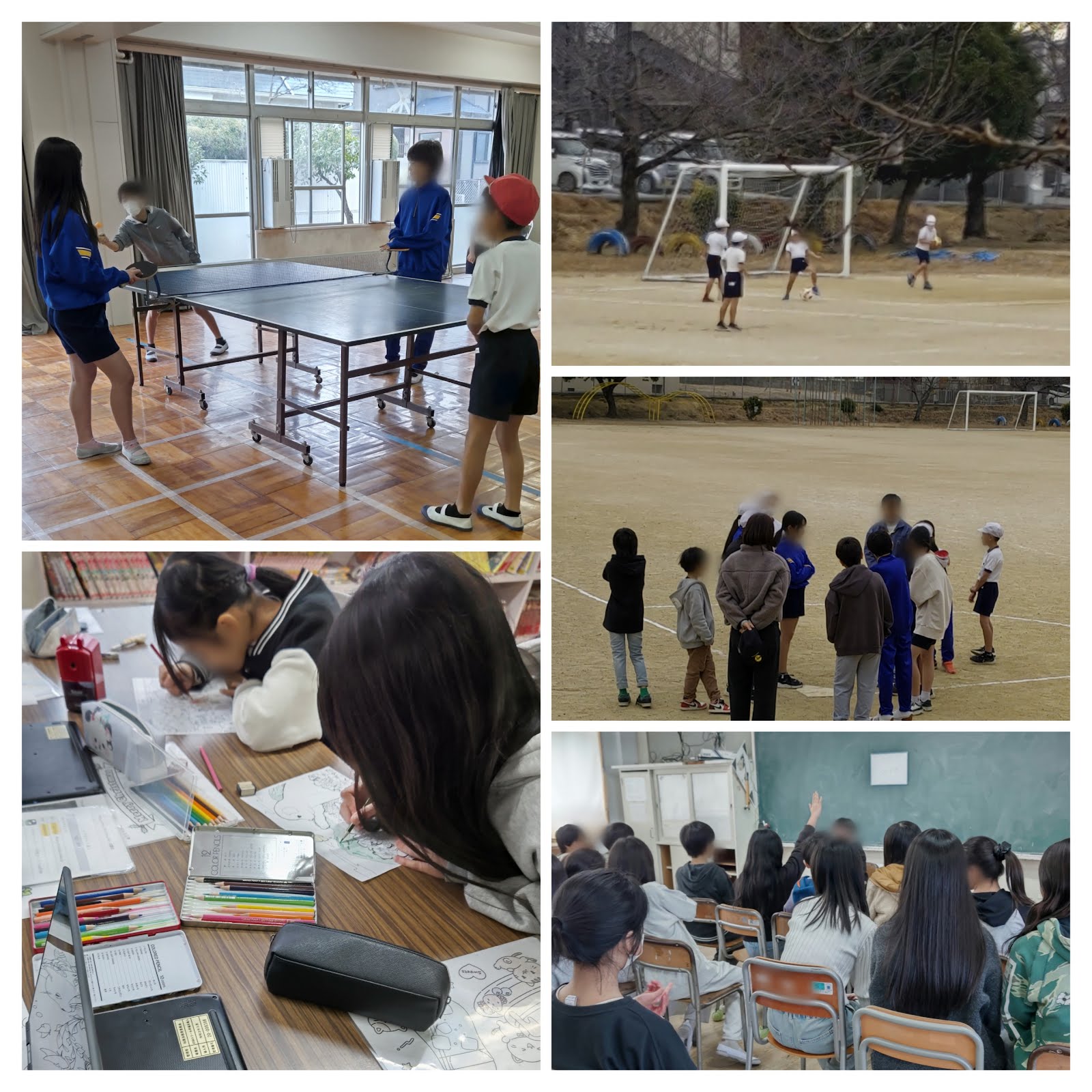 3学期初めてのクラブです。卓球・イラスト絵画・サッカー・キックベース・室内ゲームの5つのクラブで、4~6年生が仲よく過ごしました。